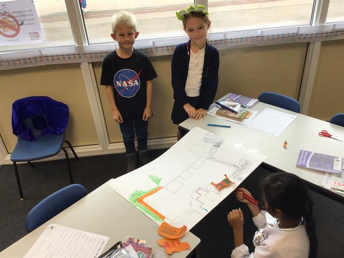 In shared reading, we read our new core text (Mo’s best friend). We made predictions of what we thought our story would be about, we answered retrieval questions and we made inferences about each character based on items we pulled out of a mystery box.