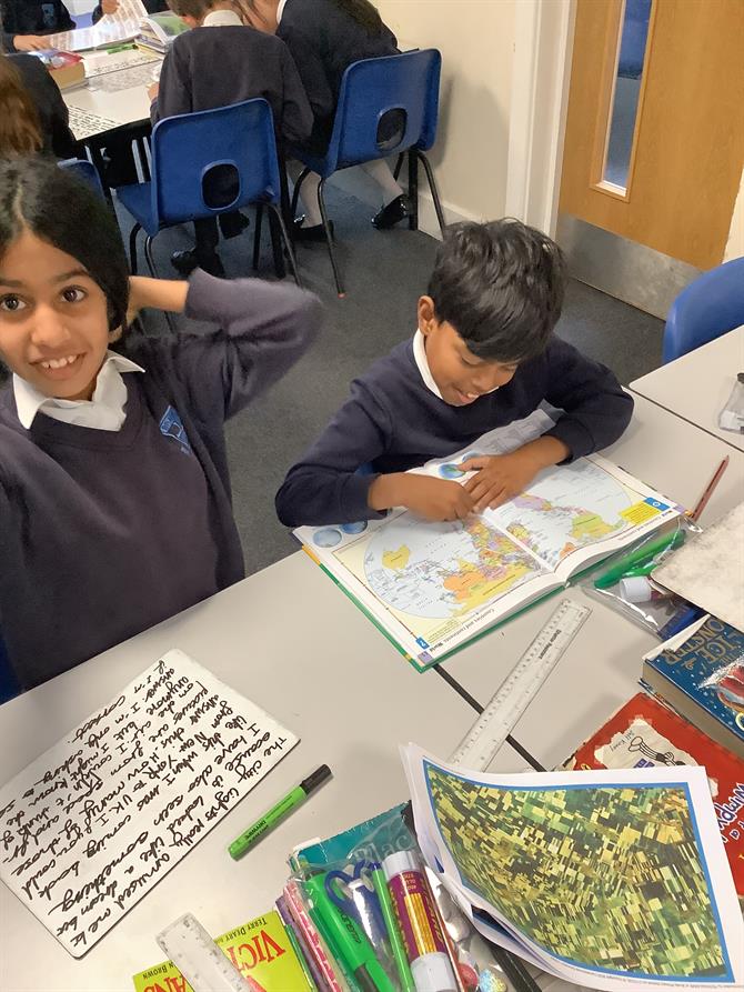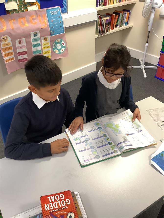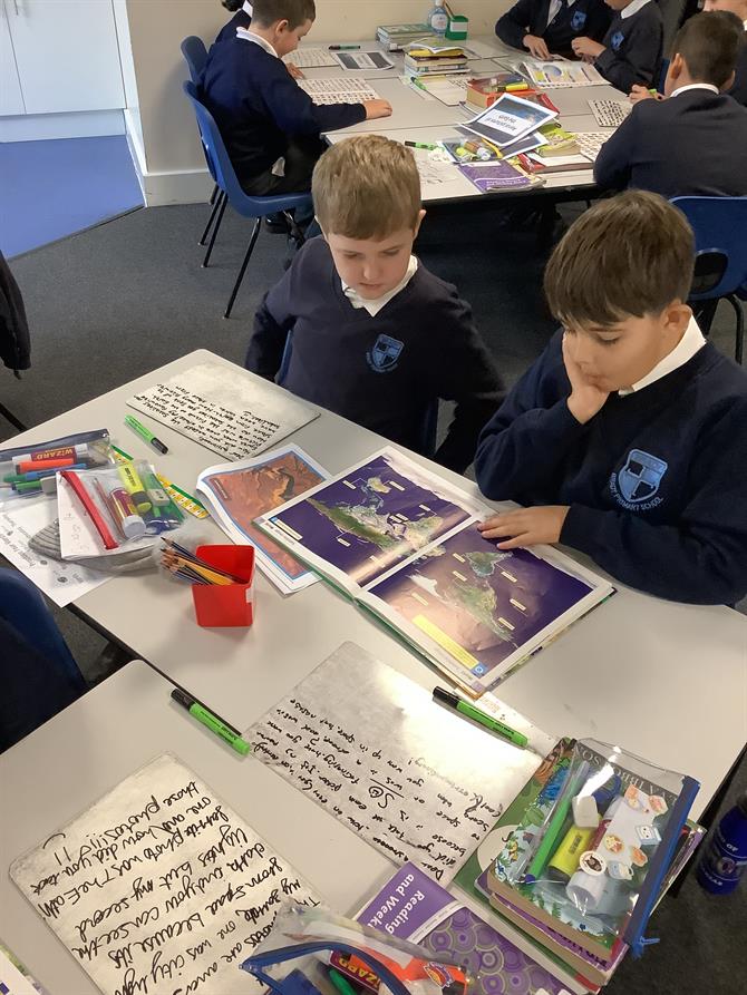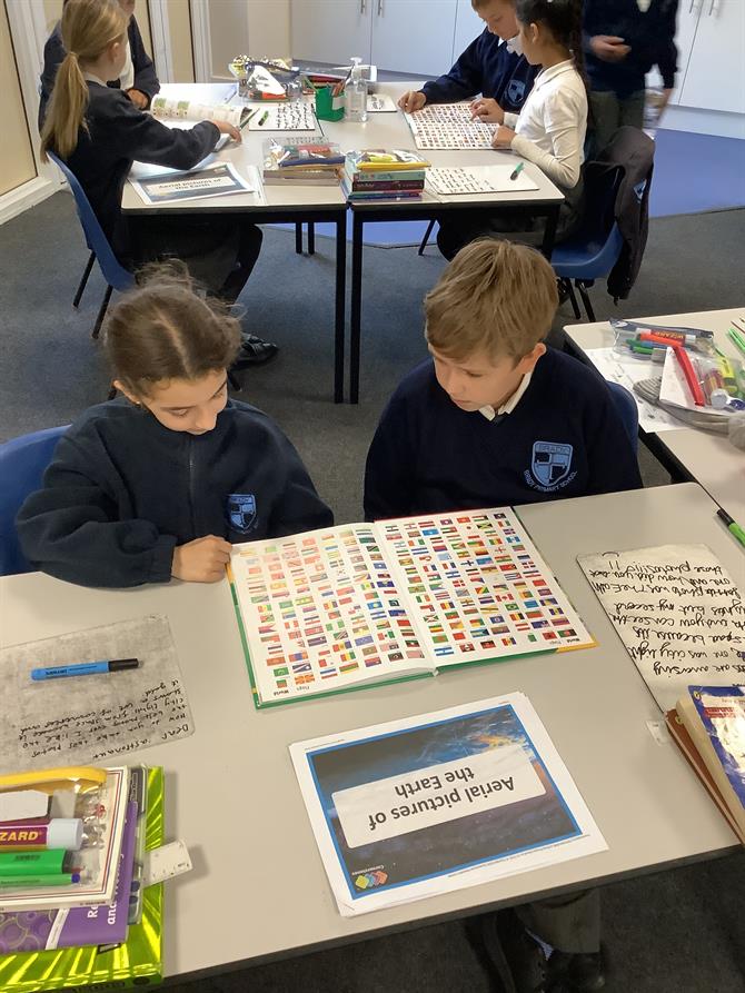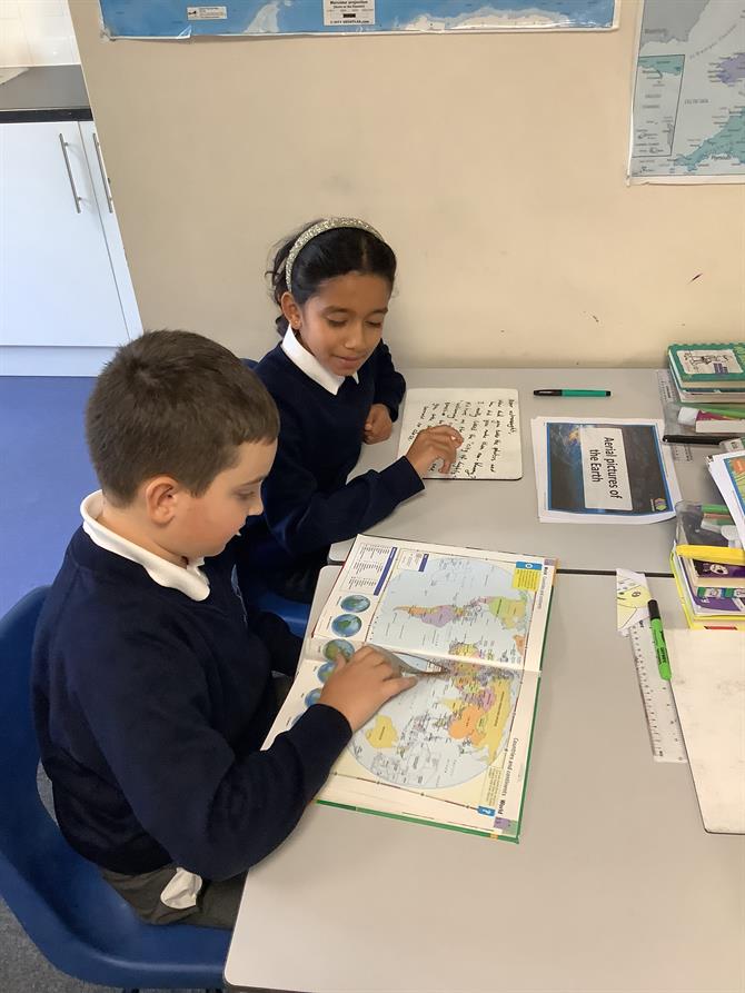 This week we also had a Geography lesson, linked to Stargazers. In this lesson, we looked at different aerial images of the earth, taken from a satelitte in space. The images included the pyramids of Giza, Europe at nightime and the Grand Canyon. We also used atlasses to locate these different places, and we were shocked by the children's amazing knowledge of world geography!