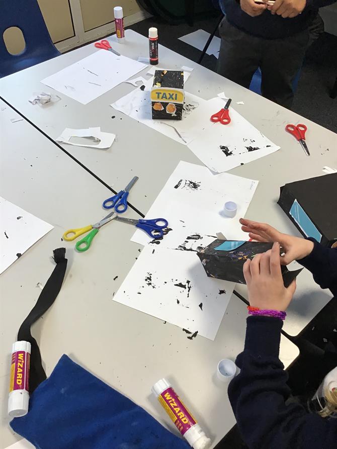 During D+T lessons we have been learning about wheels, axles and chassis and have been creating our own black taxi for Paddington to travel in! We have to paint boxes and add pegs to hold the axles. We also had to use elastic bands as washers to hold the wheels in place. It was quite a fiddly task! We used dowel rods and cut them to about 20cm to attach the wheels to the axle! We really enjoyed making our D+T projects.
