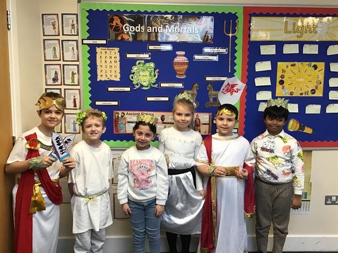 For History we had our amazing Ancient Greek day. As well as the amazing outfits, we had the best day living the life of an Ancient Greek. We learnt how to do Greek dances, write in Ancient Greek letters, write numbers Ancient Greek and designed Ancient Greek pottery. In the afternoon we made some Tzatziki dip which we enjoyed with pitta’s and chopped pieces of halloumi!