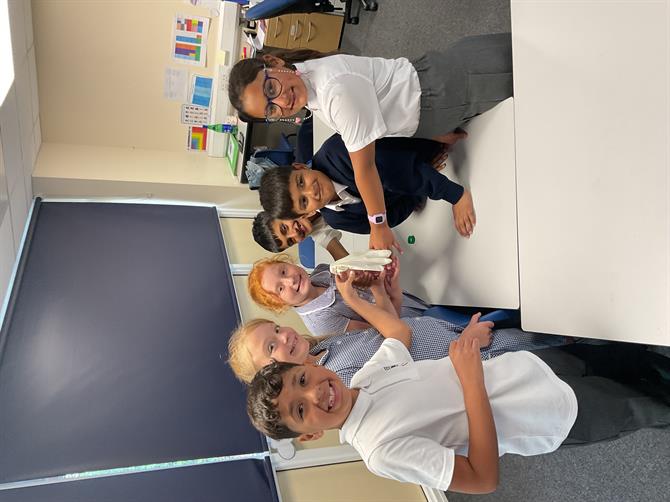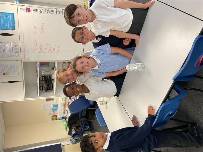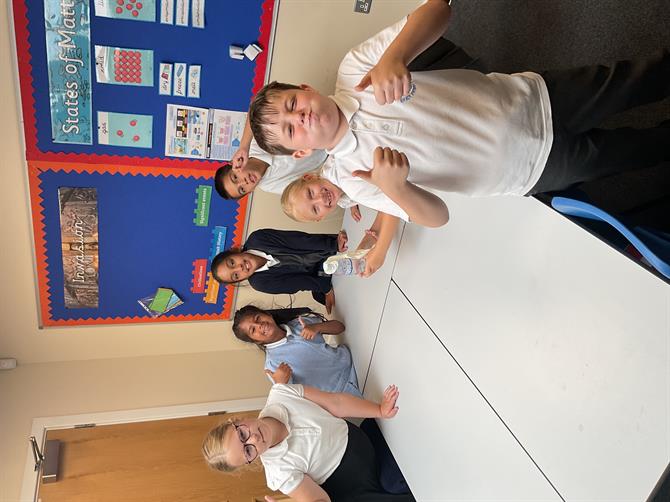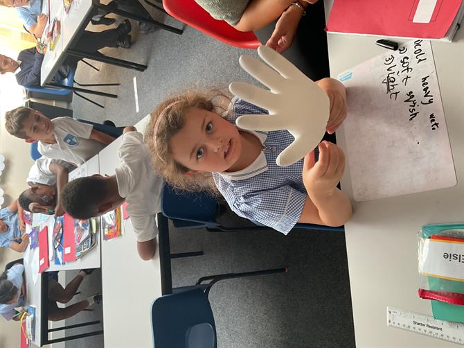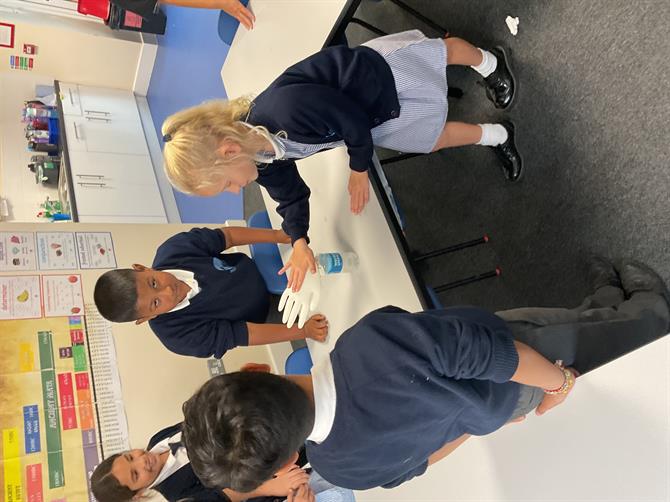 In science, we have started our new topic states of matter and we looked at solids, liquids and gases in out first lesson. We went through the different properties of these and how we could identify them. They then sorted out different solids, liquids and gases into the correct groups. We also had a fun experiment with bicarbonate of soda and vinegar. The children tied a glove on the top of this mixture and recorded the reaction. The glove was filled with gas from the reaction.