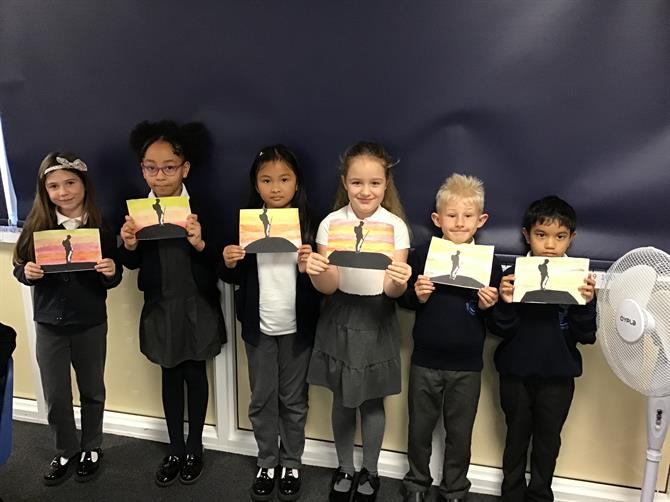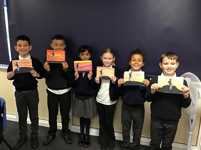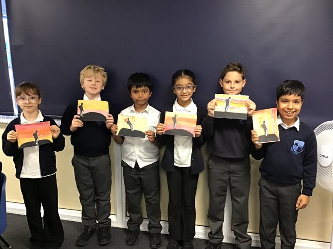 For Remembrance Day, we all made a beautiful silhouette picture of a solider standing on a hill with a sunset background. The children really enjoyed learning about the history of Remembrance Day and creating their art to be displayed in the school hall!