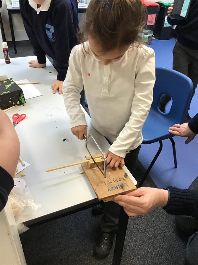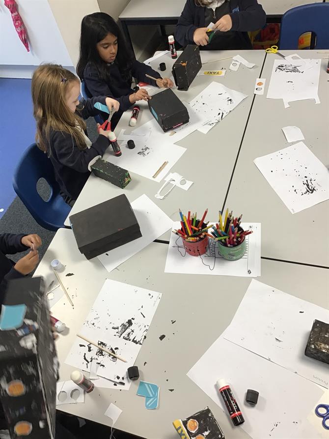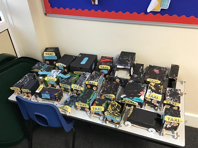 During D+T lessons we have been learning about wheels, axles and chassis and have been creating our own black taxi for Paddington to travel in! We have to paint boxes and add pegs to hold the axles. We also had to use elastic bands as washers to hold the wheels in place. It was quite a fiddly task! We used dowel rods and cut them to about 20cm to attach the wheels to the axle! We really enjoyed making our D+T projects.