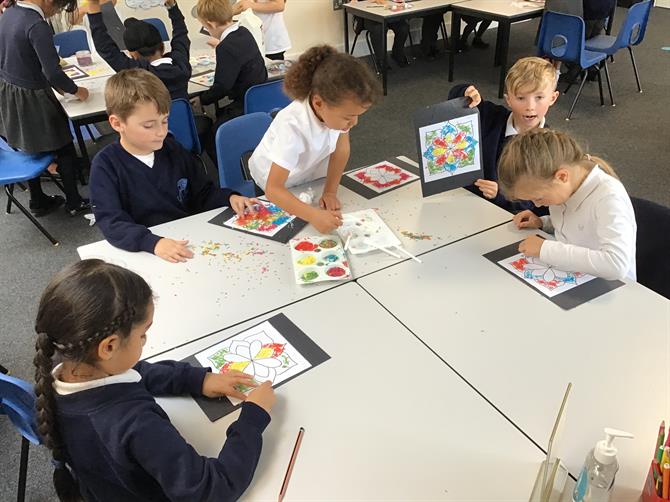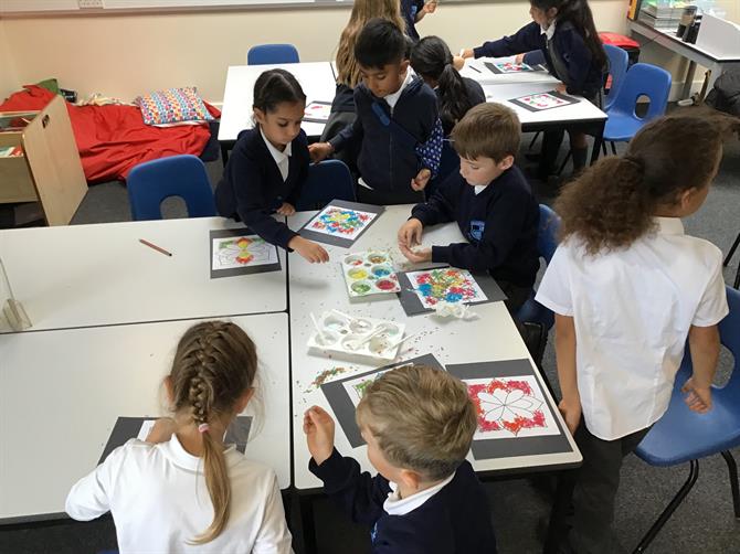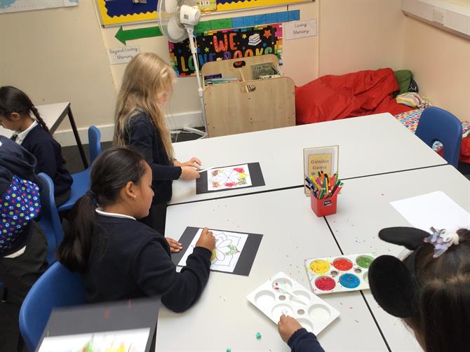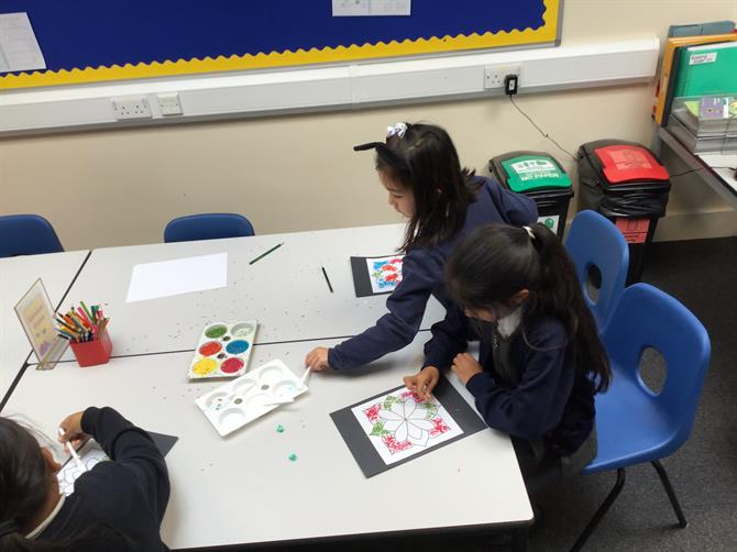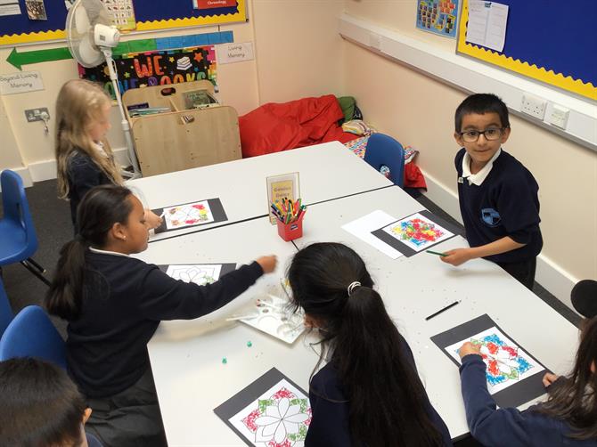 and children had a go at using coloured rice to create their own Rangoli patterns!